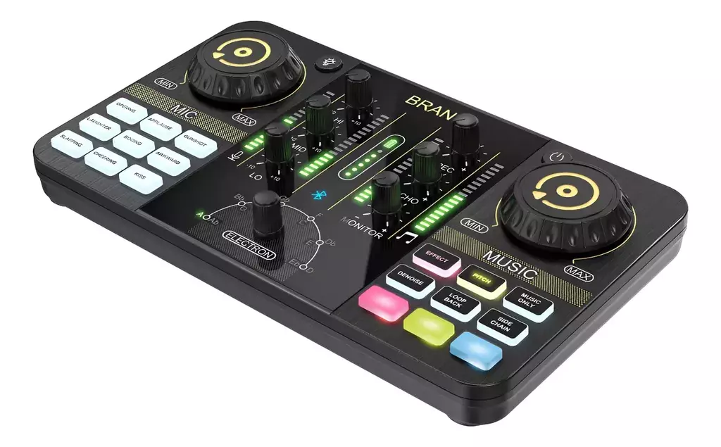Botones de procesamiento de audio: Funciones como modificación de tono (Pitch), denoise para reducir ruido, music only para aislar música, y loop back o side chain para manejar el volumen de la música durante la voz, brindan control completo sobre el audio.